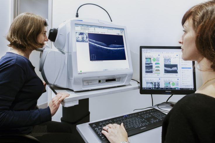 L’OCT ou tomographie à cohérence optique s’est considérablement développée depuis les années 2000. Elle est effectuée en position assise, après dilatation des pupilles. L’examen permet une analyse des différentes structures du fond d’œil observées dans leur épaisseur, et constitue donc un complément utile à l’angiographie qui analyse ces mêmes structures en deux dimensions.